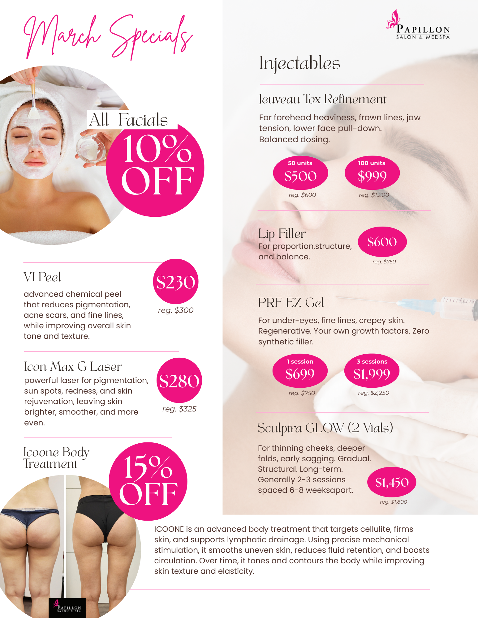 PAPILLON MED SPA is the premier full-service spa in Mount Prospect offering comprehensive skin care treatments for the body and face. We strive to provide an exquisite spa experience that promotes relaxation and rejuvenation with our wide selection of services. From facials and chemical peels to waxing and laser hair removal, our highly trained and passionate skin care team has something to offer for everyone. We stay ahead of the curve by utilizing the latest products, devices, and technology such as the Icon MaxG Laser for advanced treatments like Botox, dermal fillers, PRP treatments, RF Microneedling, vessel removal and pigmentation, and much more. For those wanting to improve their bodies’ appearance, we offer body contouring, cellulite reduction, skin tightening and scar and stretch marks reduction to restore a youthful appearance. Experience the luxurious PAPILLON MED SPA today for all your skin care needs.